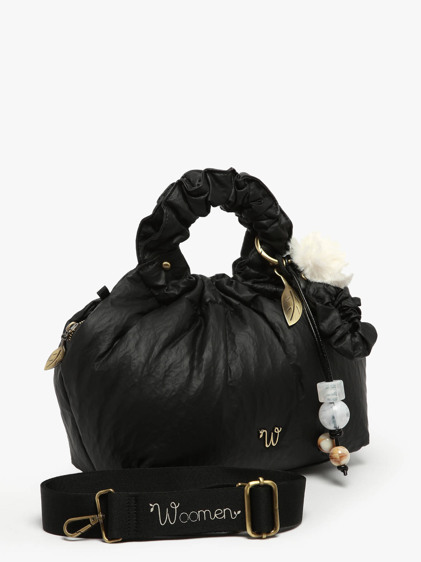 Ce sac bandoulière WOOMEN de la ligne ALIZIER se porte à la main grâce à sa poignée recouverte de polyuréthane ou en bandoulière intégrée, alliant praticité et style. Confectionné en polyuréthane avec doublure coton et lin, il offre un compartiment unique, deux poches simples et une poche zippée. Son bijou de sac orné d’un chouchou, de perles et d’un pompon, ainsi que son logo W en métal et sa bandoulière imprimée ""WOOMEN"", signent son élégance.